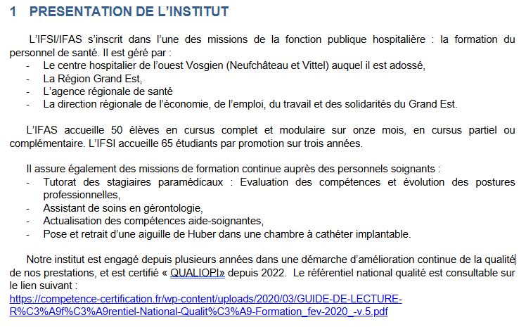 Les instituts de formation en soins infirmiers et aides-soignants se situent sur le territoire du pays de l’Ouest Vosgien et présentent une position limitrophe de trois départements : • La Haute Marne • La Meuse • La Meurthe et Moselle Ils ont comme établissement support le Centre Hospitalier Intercommunal de l’Ouest Vosgien, dont le siège social se situe à Neufchâteau. L'infirmier ou l'aide-soignant formé à l'Institut de Formation développera des savoirs et des compétences professionnelles lui permettant de : • Répondre aux besoins de santé d'un individu ou d'un groupe de personnes. • S'adapter aux différents domaines d'activités. • S'inscrire dans l'évolution des techniques et du système de santé. • Cultiver une posture de questionnement et de recherche en soins. • Affirmer sa spécificité professionnelle. Les objectifs de la formation se centrent aujourd'hui sur des compétences à acquérir à partir de situations professionnelles. Les orientations de la formation prennent en compte les données du territoire vosgien et les projet prioritaires du Plan Régional de Santé (PRS) Nos intentions pédagogiques privilégiées pour l'IFSI et l'IFAS sont en lien avec : • L'individualisation de la formation • L'accompagnement personnalisé des étudiants et élèves • L'alternance intégrative • La pratique réflexive • Les pédagogies innovantes (simulation en santé, E-learning...)